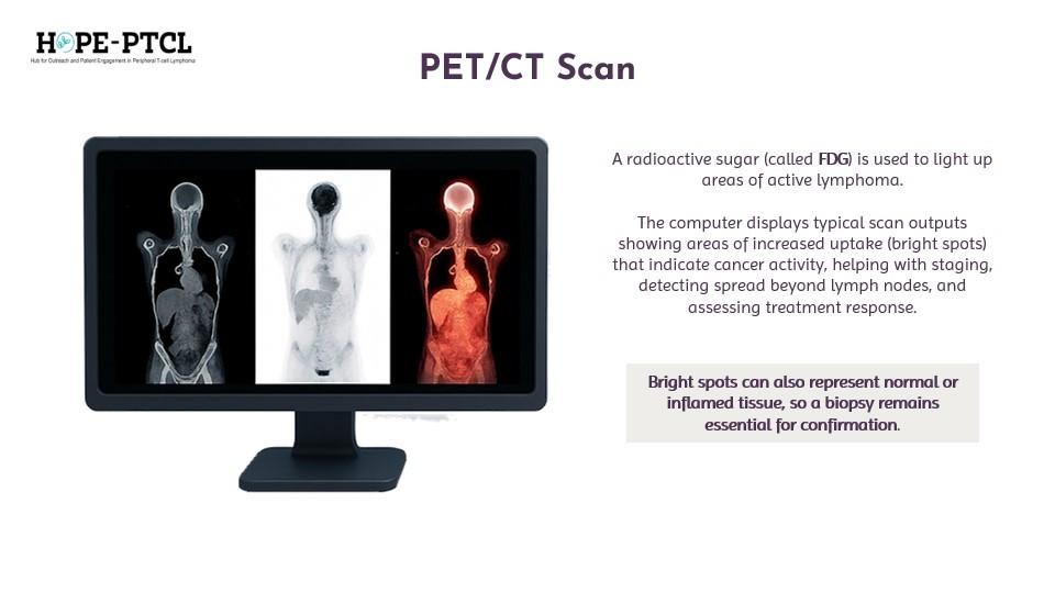 Figure: A PET/CT scan is a full-body imaging test that uses a small amount of radioactive sugar called FDG to highlight areas where cancer cells may be active. Most T-cell lymphomas show up clearly on PET scans because they are FDG-avid. Bright spots on the scan do not always mean cancer; they can also reflect normal activity or inflammation. That’s why a biopsy is always needed